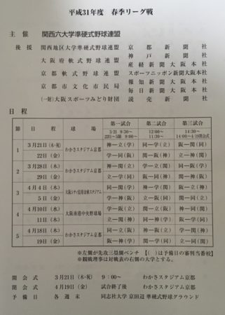 西都六大学準硬式野球_2019年春季リーグ戦の日程は、下記の通りです。 開幕は、3月19日(火)、寝屋川第1野球場で熱い戦いが始まります。 尚、春季リーグ戦日程は、本連盟又は西都六大学のTwitterにも掲載しています。